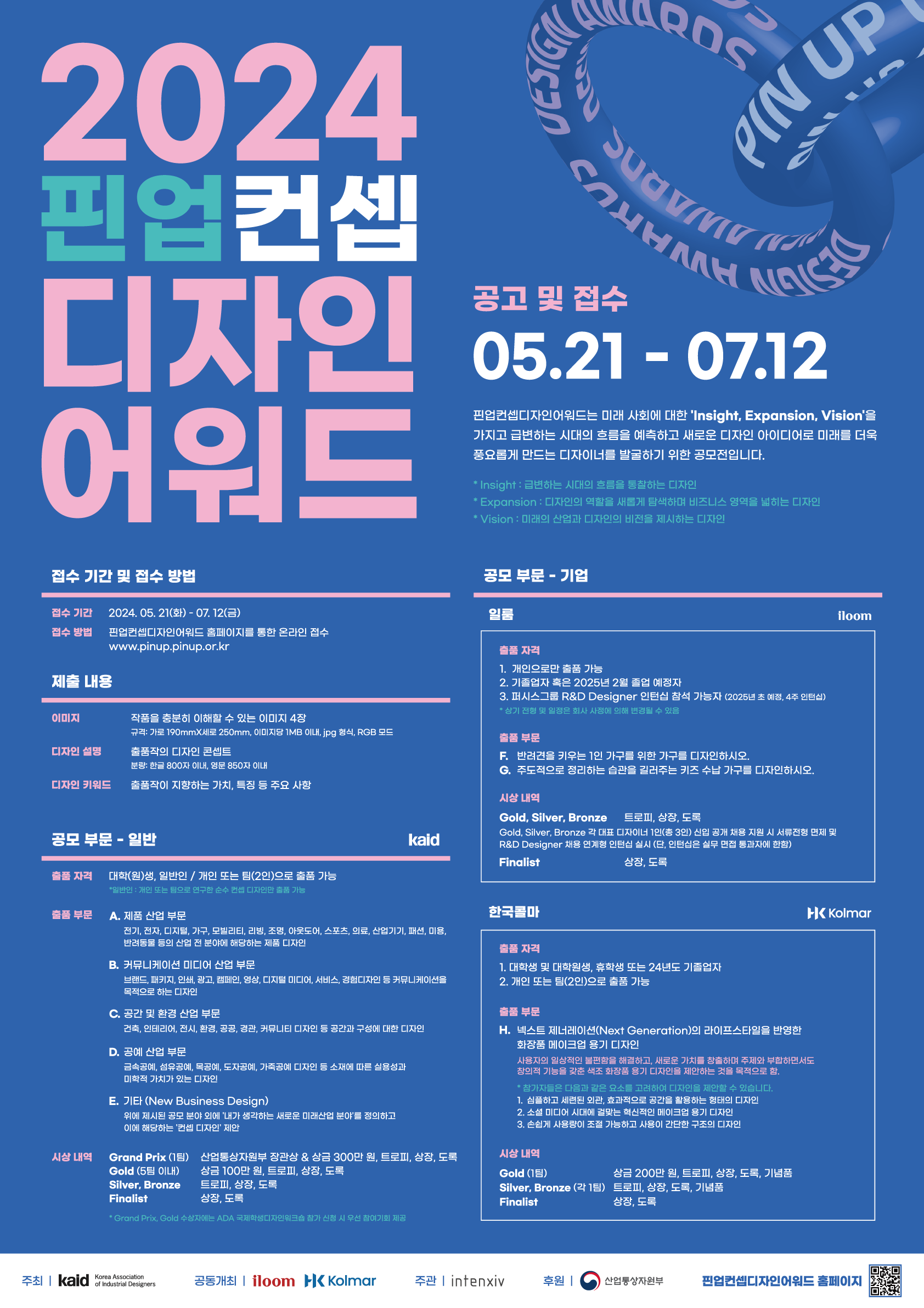 2024 핀업컨셉디자인어워드는 사단법인 한국산업디자이너협회(kaid) 주최주식회사 인텐시브 주관산업통상자원부가 후원하는 디자인 공모전입니다. 2024 핀업컨셉디자인어워드는 일반(kaid) 부문과 기업(일룸한국콜마부문으로 공모하며 일반 부문 대상 수상자에는 산업통상자원부 장관상과 상금 300만원이 수여되고, Gold 수상자에게는 상금 100만원이각 상격별로 국제 학생 디자인 워크숍 우선 참여기회트로피상장도록 등의 부상이 수여됩니다기업(일룸한국콜마부문의 본상 수상자에는 현업 체험 기회 및 채용연계형 특전상금과 기념품 등이 수여됩니다사단법인 한국산업디자이너협회는 참가자들의 창의적인 디자인이 공정하게 평가받고 나아가서는 기업과 사회에 활용될 수 있는 기회를 가질 수 있도록 최선을 다하고 있습니다.