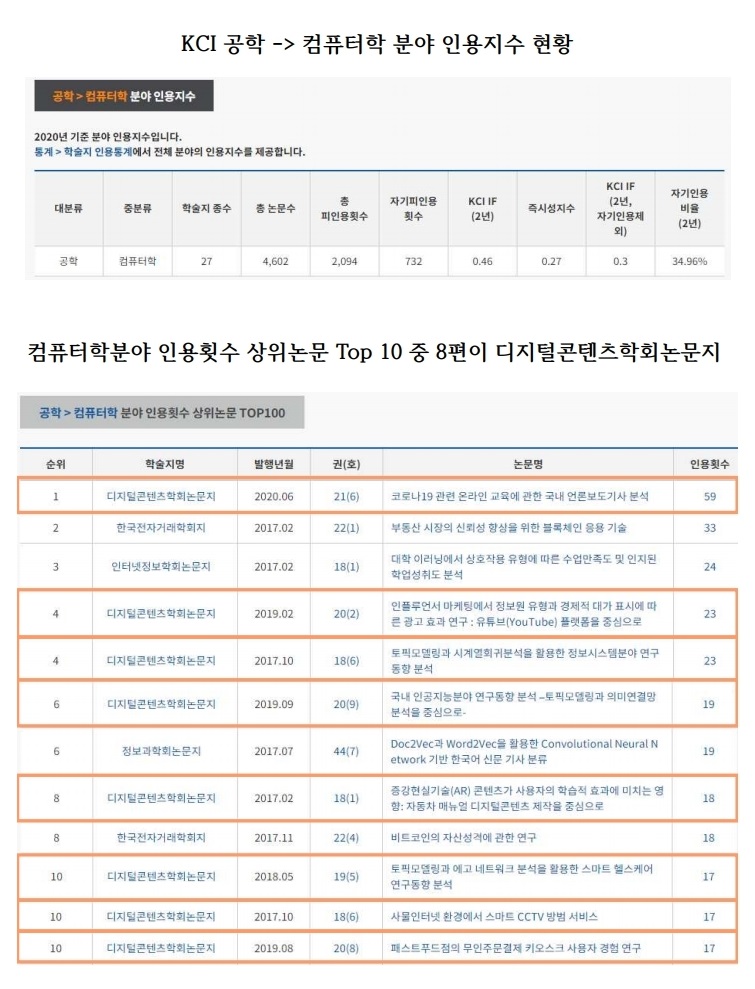 컴퓨터학분야 인용횟수 상위논문 Top 1 : 디지털콘텐츠학회논문지 게재