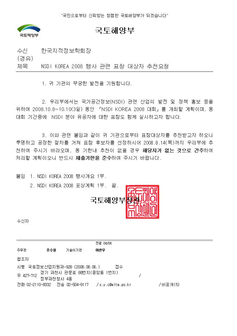 NSDI KOREA 2008 대회 포상추천에 관한 공문입니다.